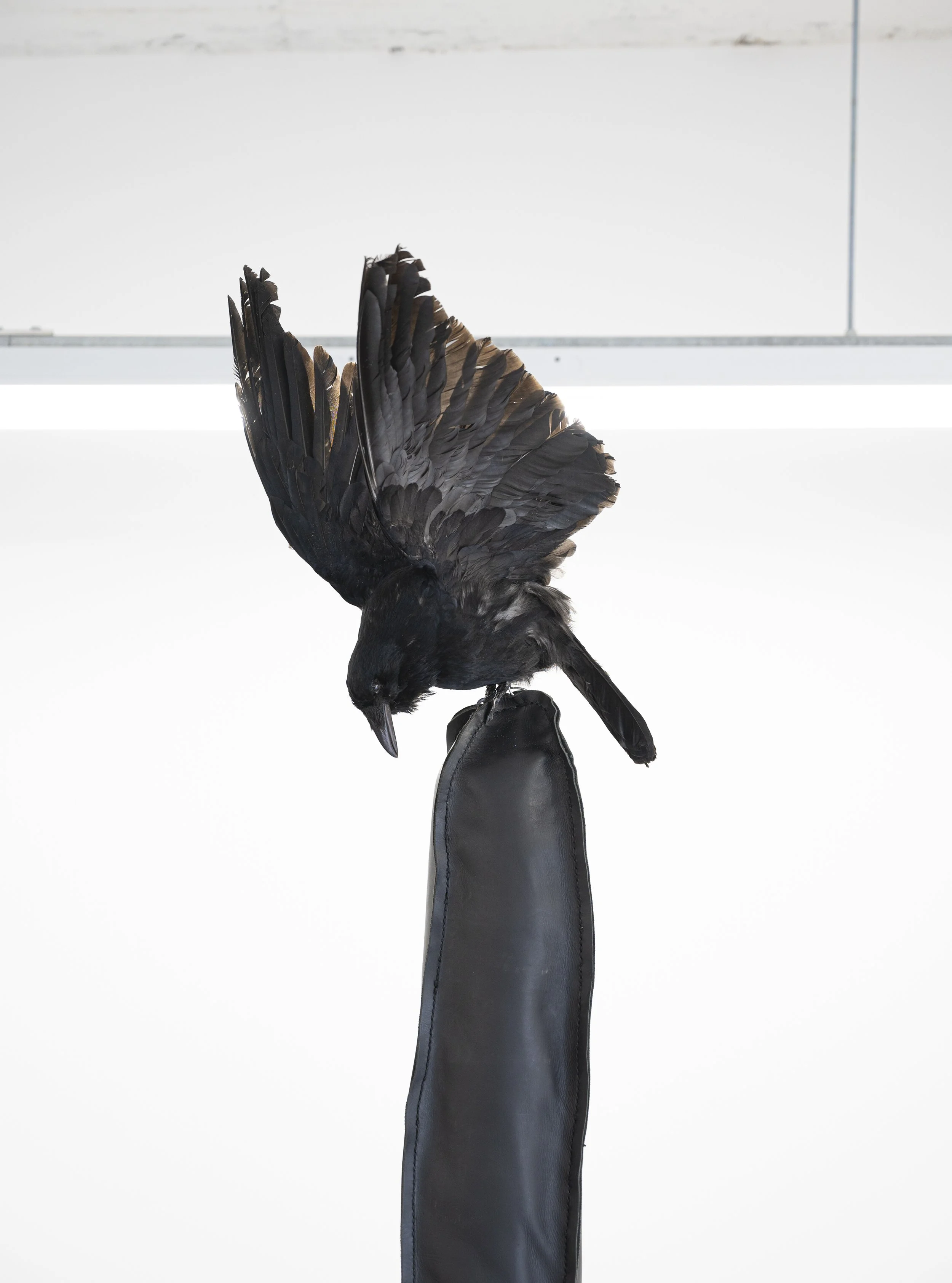 hand-stitched leather, steel, cement, tourmaline, taxidermy crow