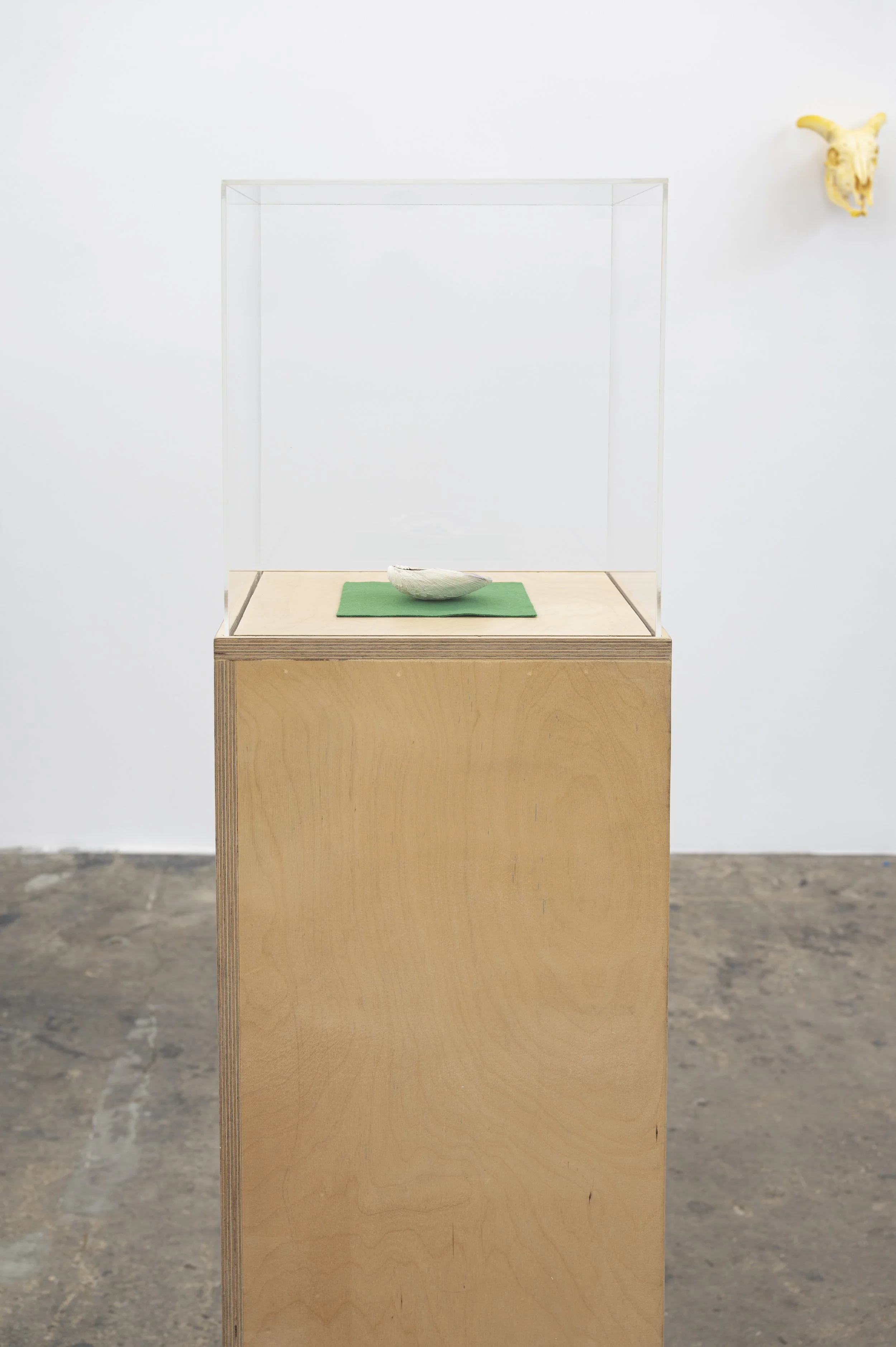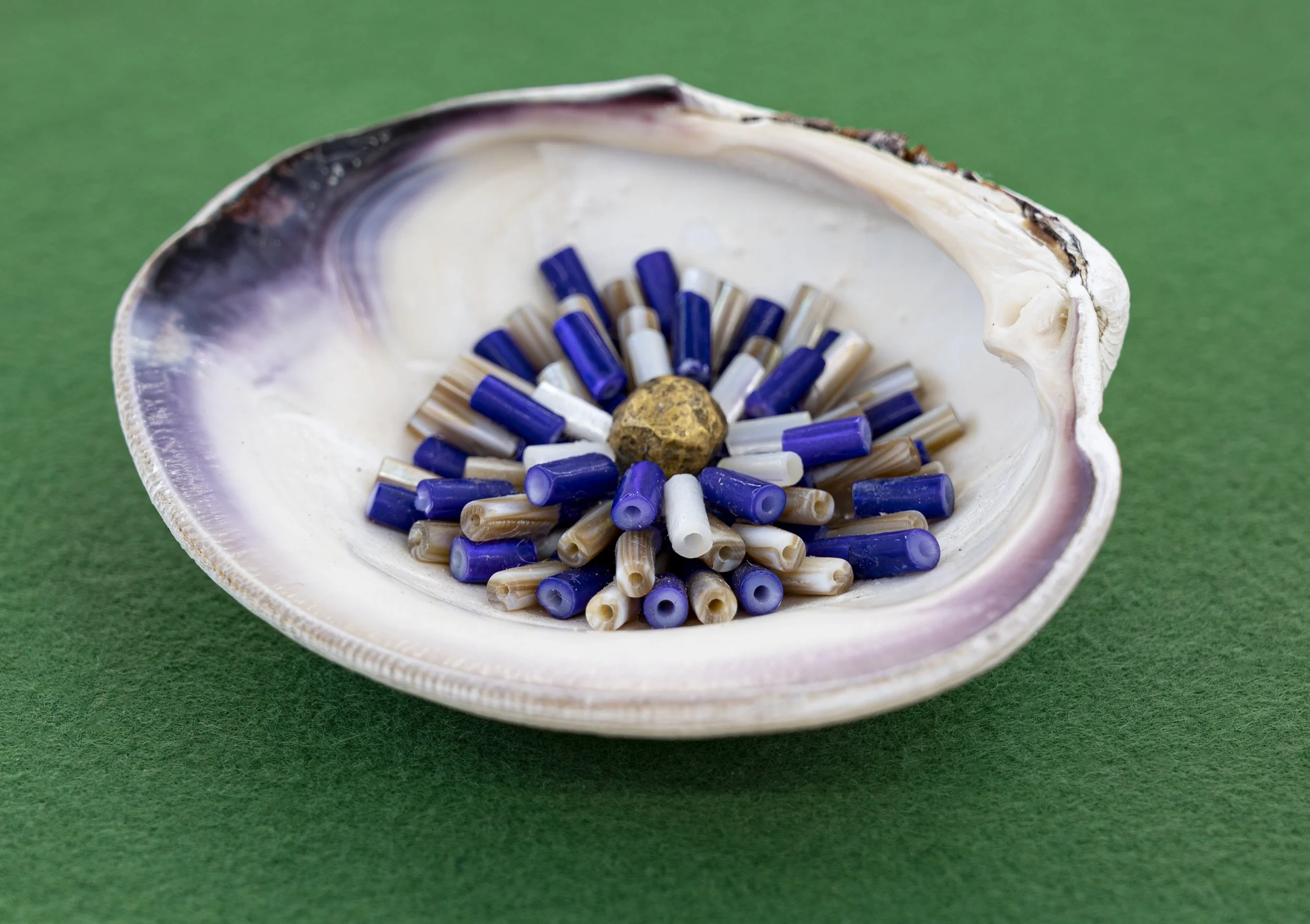 clam shell, wampum, 24 karat gold, plexiglass, felt, plywood