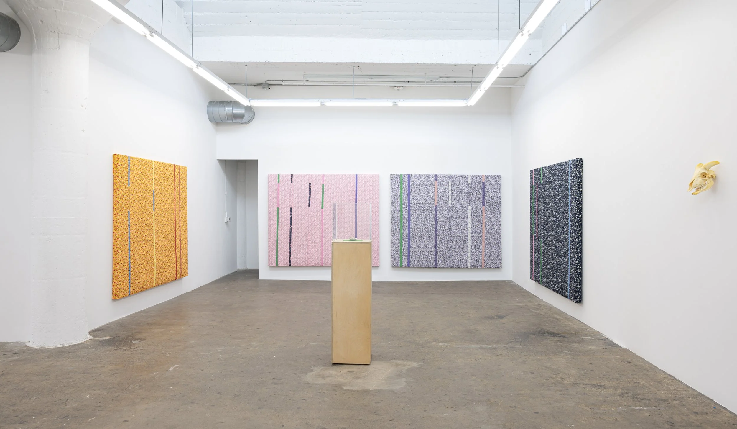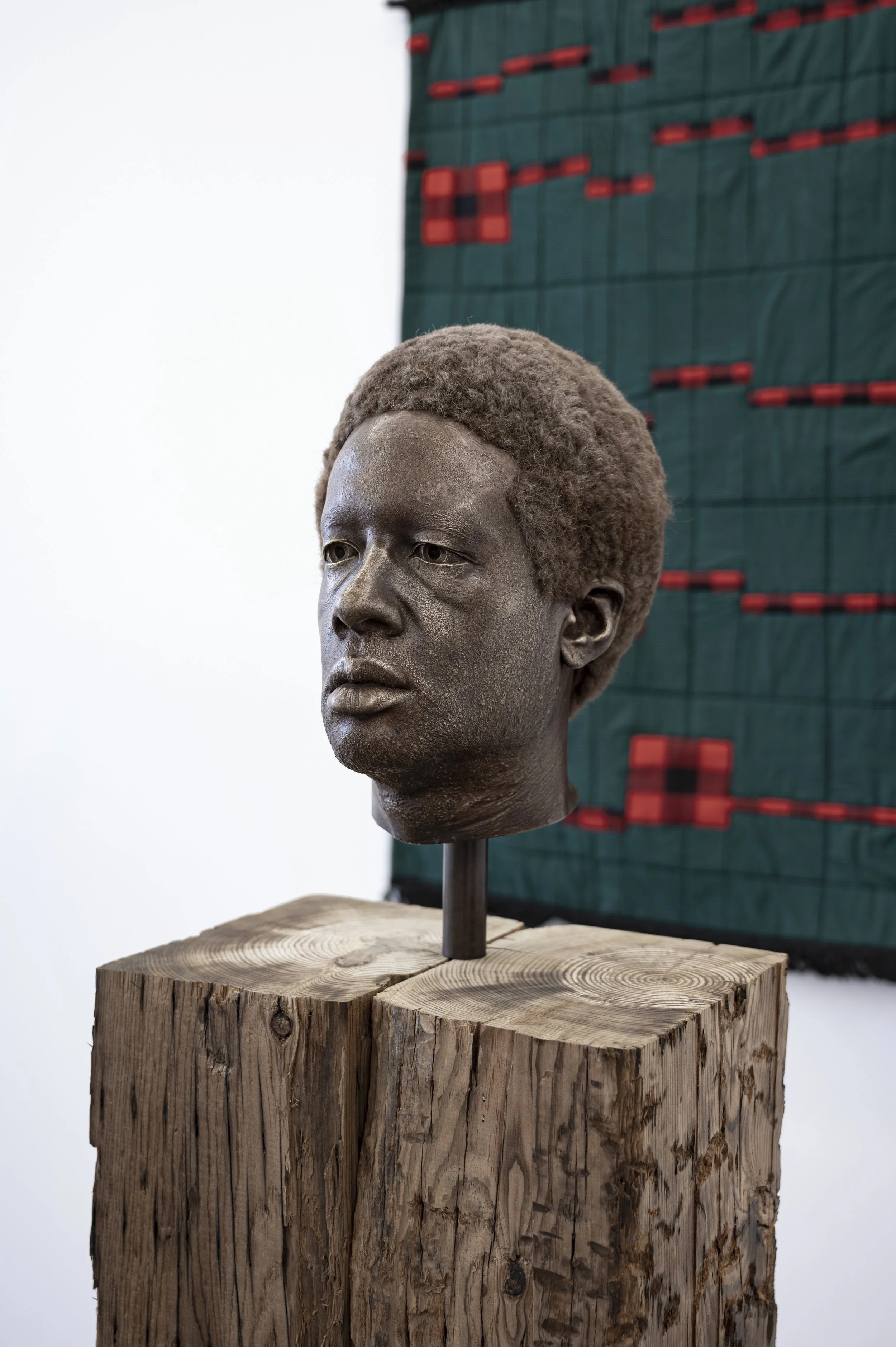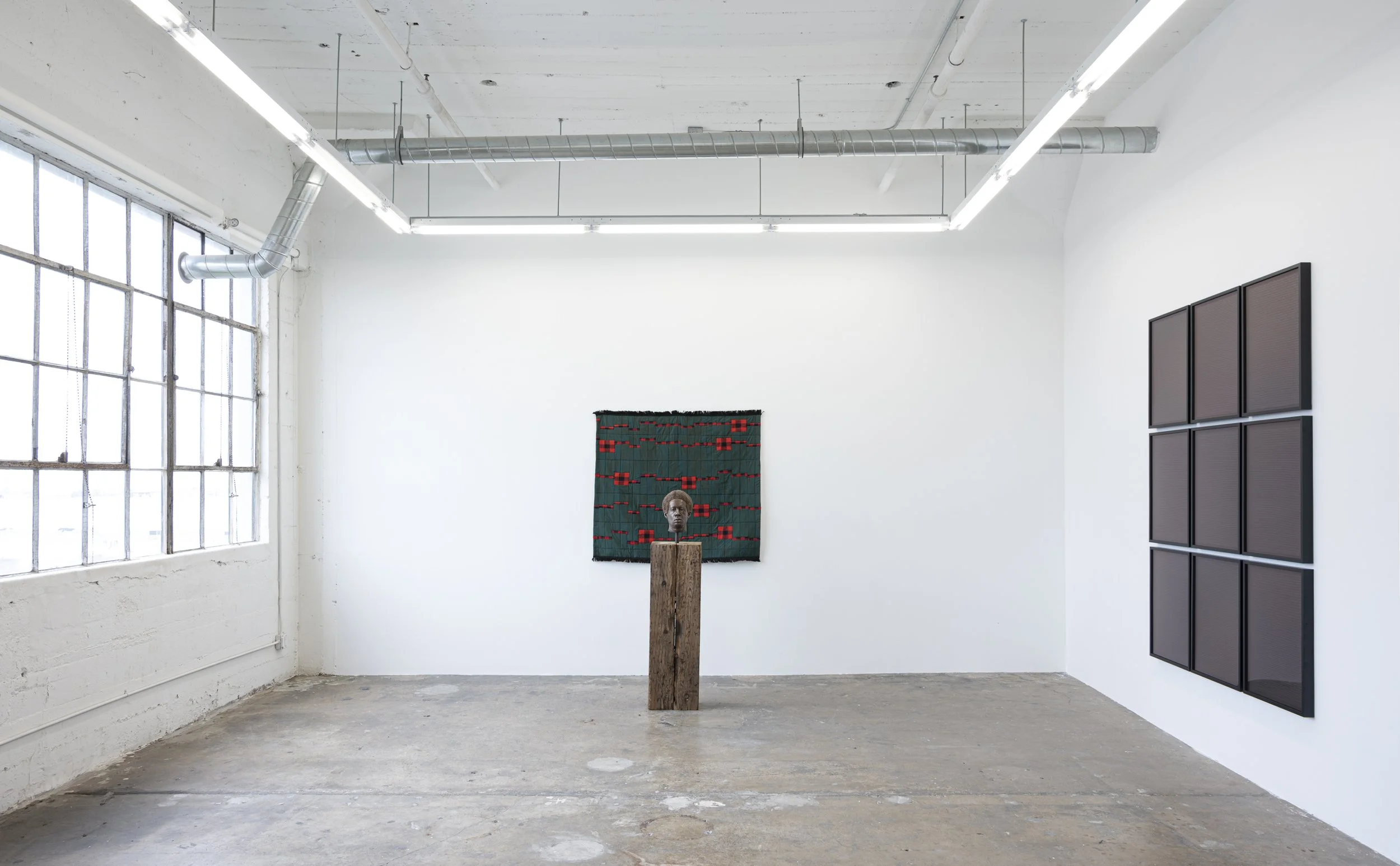 Wilding Cran Gallery is pleased to present ...of frontiers and phantoms, an exhibition of quilts,photographs, sculptures, and drawings by Ray Anthony Barrett that deepens his ongoing inquiry into the poetics of the western landscape, the mythology of Manifest Destiny, and the interrelated issues of power, capitalism, and white settler colonialism.Expanding upon his investigation of the relationship between commerce and the American imperial project, Barrett has constructed quilts with materials inextricably linked to the economic history of the United States: calico, cotton, and denim. The near-monochrome works invoke color field painting while vertical bands of fabric in contrasting hues reflect an engagement with syncopation, the sudden interruption of expected patterning present in some African textiles and musical traditions.Sculptural works further explore the frontier as both a physical and conceptual space. In Shell Company (2021), a shell cradling a cluster of wampum with a ball of 24-karat gold at its centre rests atop a piece of green felt reminiscent of a casino table, underscoring the gambling spirit that characterizes established narratives of land speculation. Perched upon a pedestal made of railroad ties, Buffalo Soldier (2022) offers a conceptualization of the railroad as a signifier of both westward expansion and “order” as defined in an industrialized context.In a critique of existing norms of intelligibility, Barrett has created drawings based on Darby English’s How to See a Work of Art in Total Darkness that repeat the words “in total darkness” hundreds of times in graphite on black paper. The arrangement of the text allows one to read it along both the X and Y axes, conjuring the rationality of the modernist grid. The drawings also subvert the convention of black mark-making on a white surface, calling into question the dubious colonial logic of bringing the “light” of reason to “dark” and “uncivilized” communities.Through this body of work, Barrett contends that subduing the continent has been a prolonged act of hubris. Our divine tasks are to reject the false binary of man versus nature and to reorganize our personal and collective destinies around our ecological interdependence.