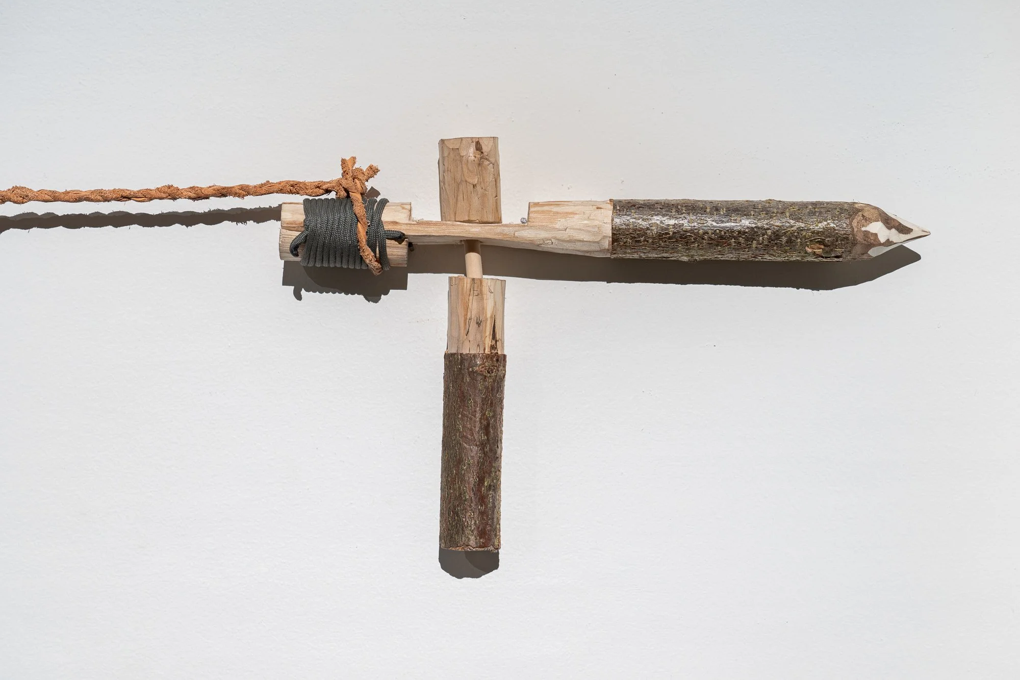 carved cedar, paracord, 57 x 47 x 41.5 inches