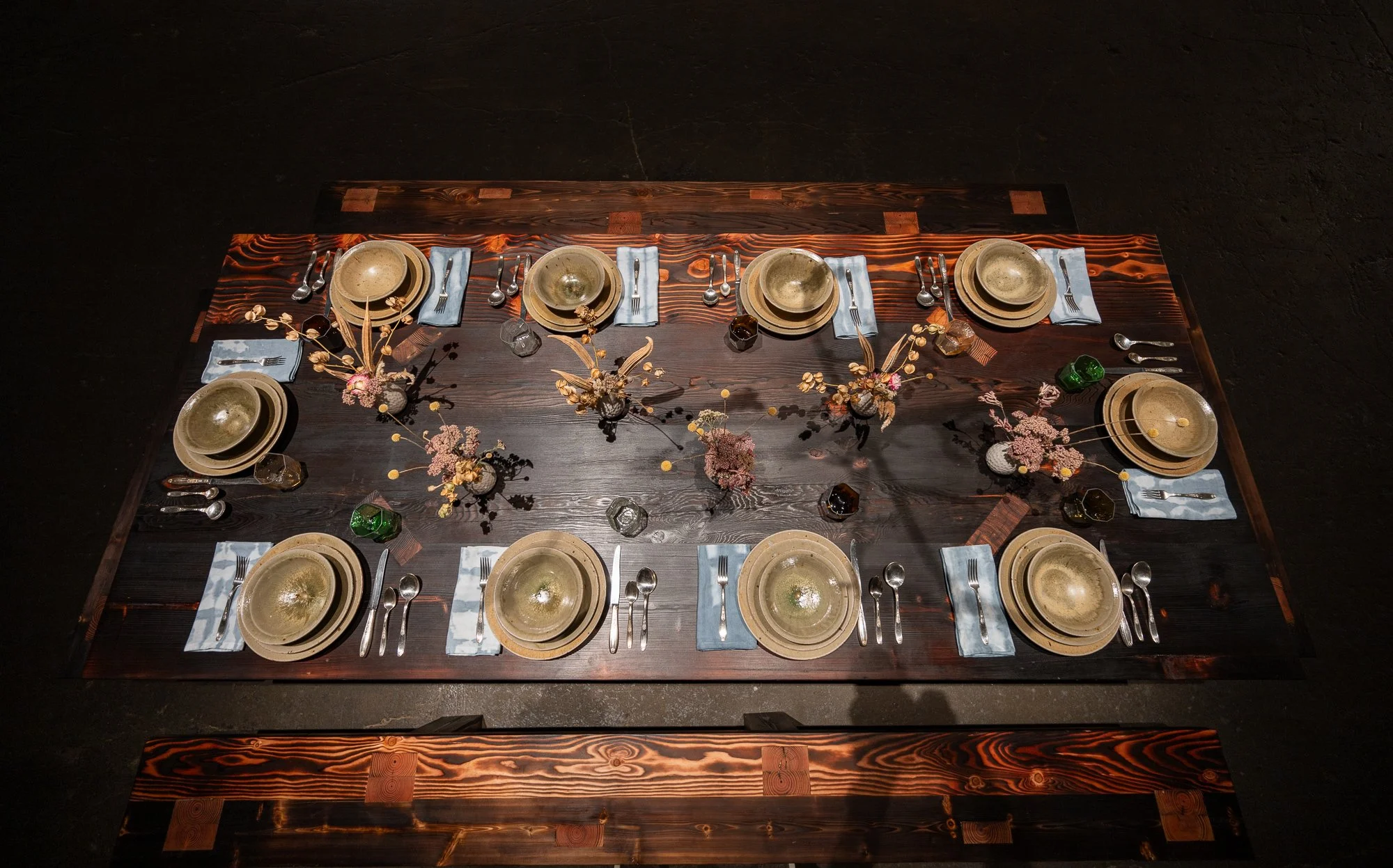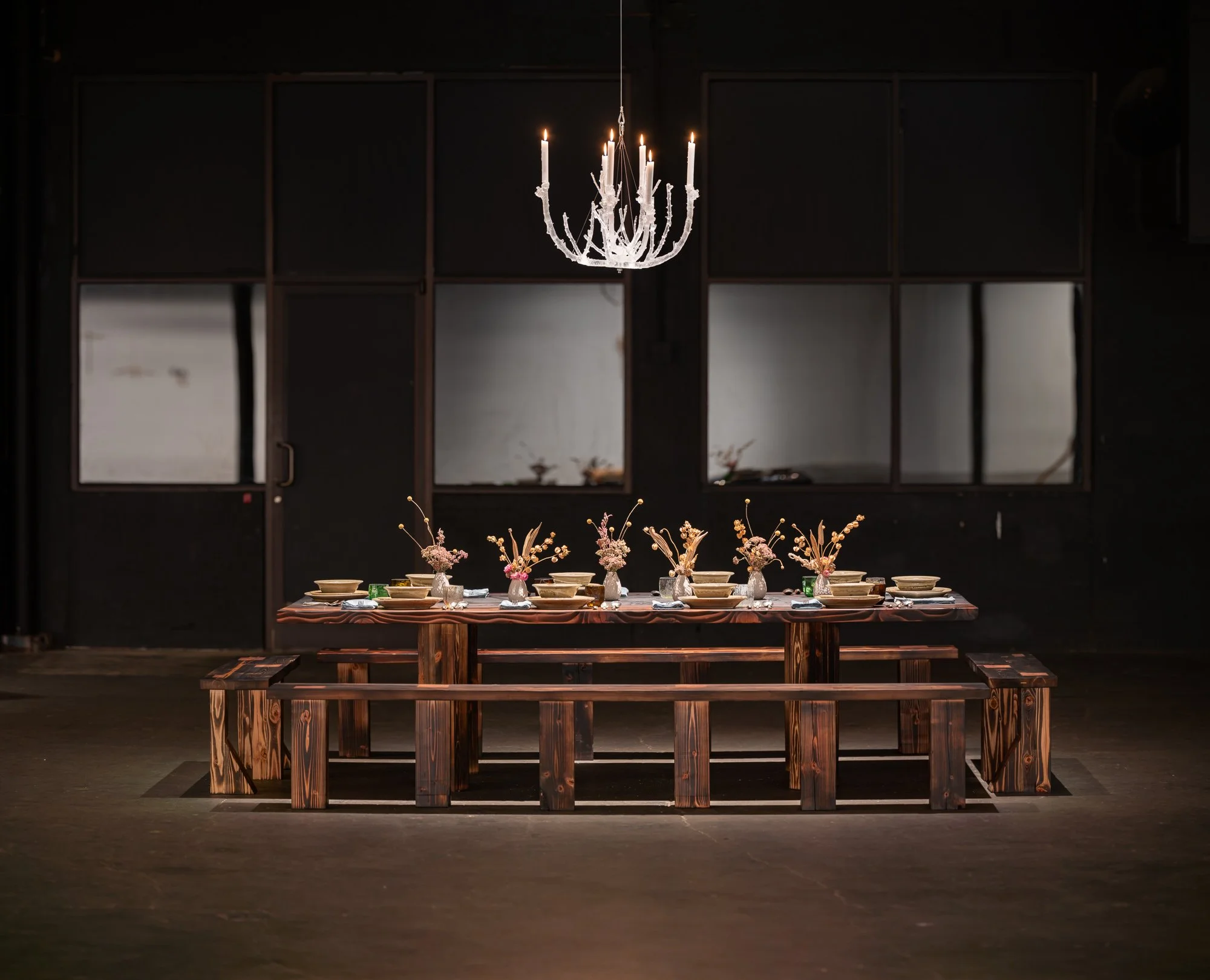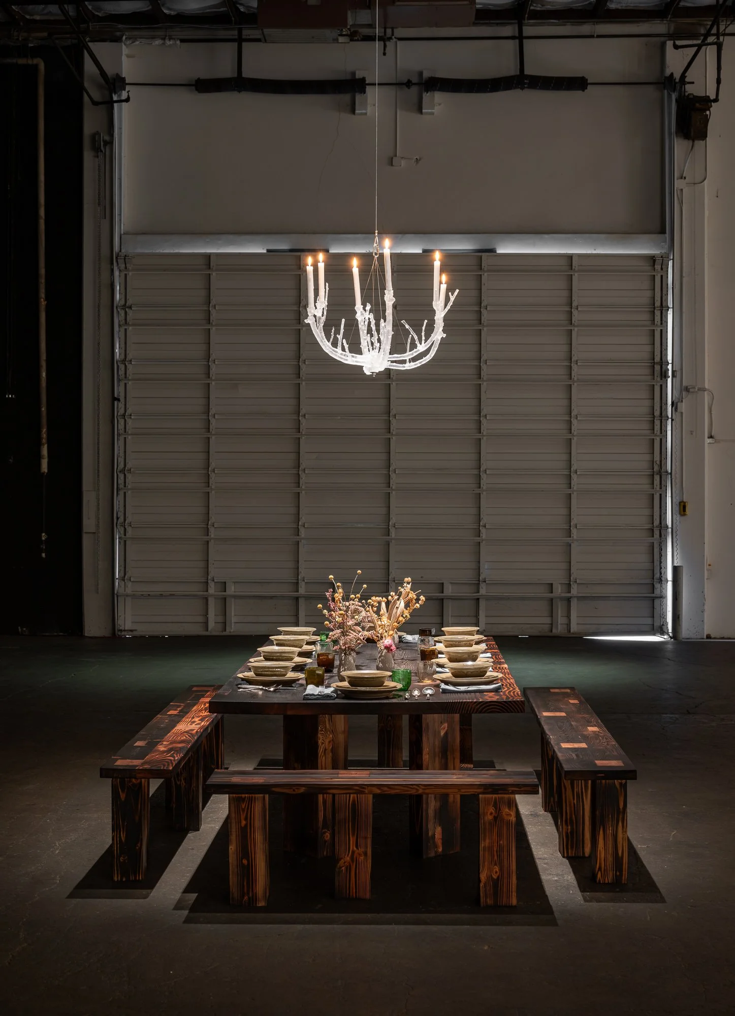 Communal Table, pine, yakisugi, shellac, table: 120 x 65 x 28.5 inches, benches: 110 x 11 x 19 inches and 48 x 11 x 19 inches