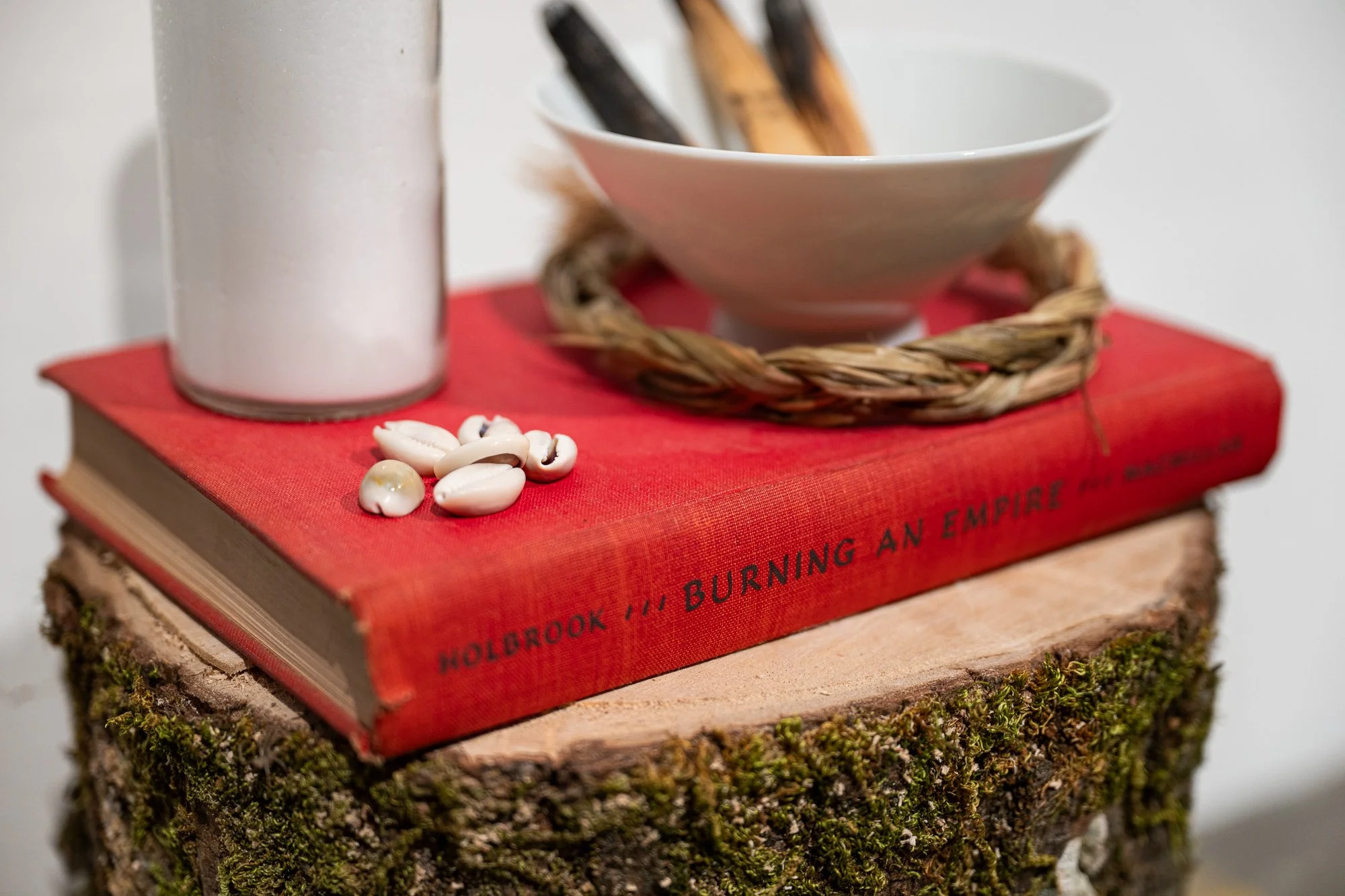 assemblage of wood log, book, cowrie shells, ceramic bowls, votive candle, Palo Santo, tobacco