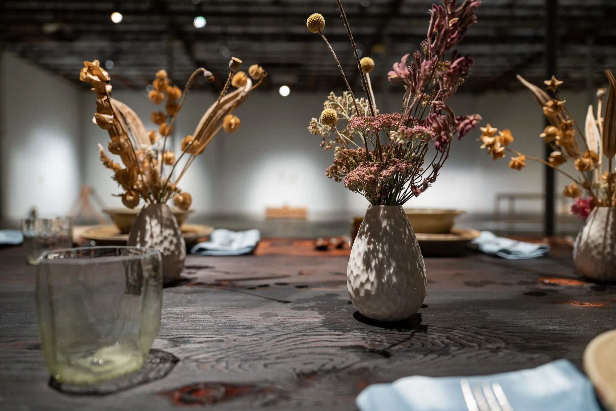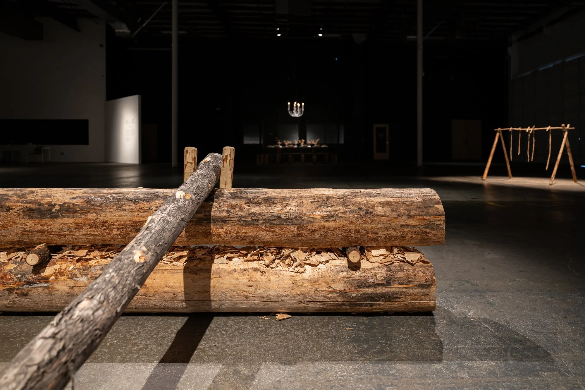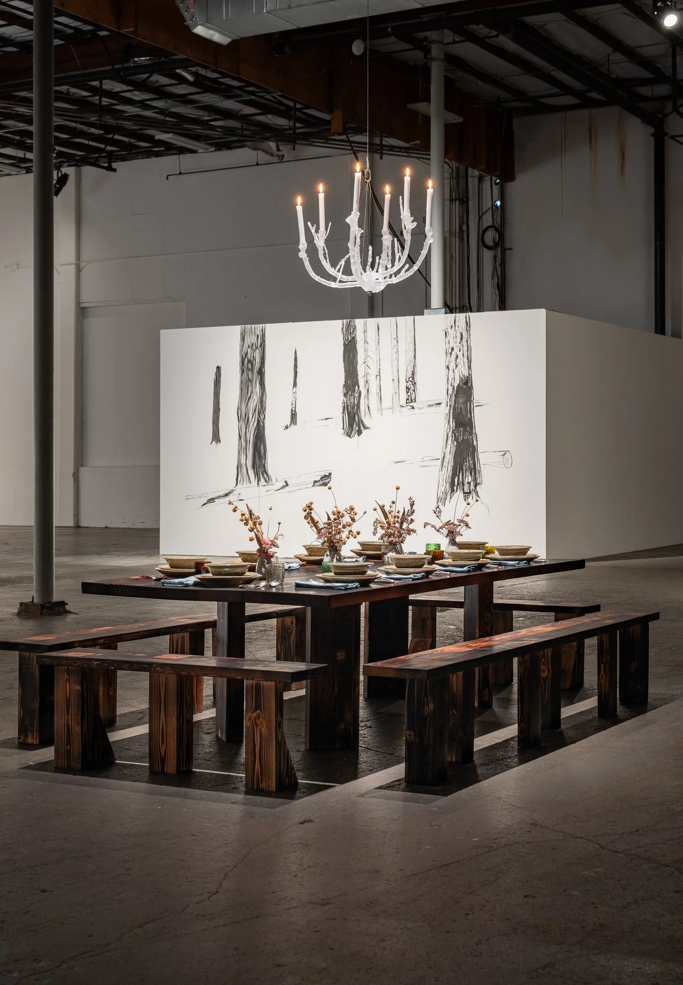 The communal and food-oriented dimensions of fire starting and keeping are a major focus of the exhibition, which features a collaboratively-designed dining area and space dedicated to fire-based cooking. The hearth and table are where people come together to share stories and meals, and to take care of one another. For Barrett, utilizing repurposed and reclaimed materials made through collaboration embodies a holistic philosophy of art that is characteristic to many African, Asian, and Indigenous aesthetic traditions, without hierarchies or divisions between fine art, functional design, or craft, and animated by the art of living, eating, storytelling, spirituality, and dancing.